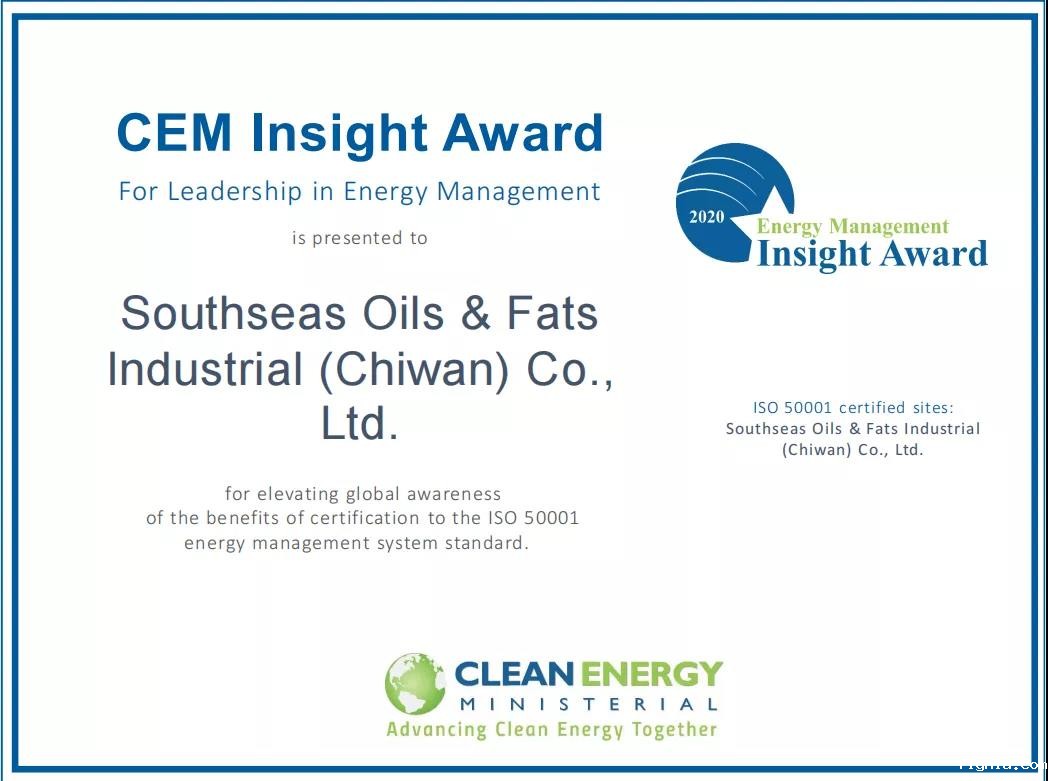2020年唯一荣获CEM能源管理洞察奖的粮油食品企业