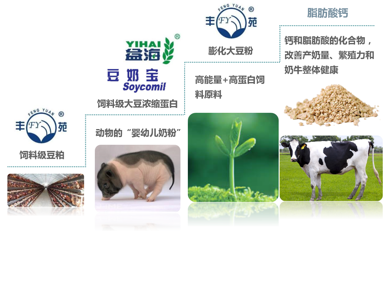 饲料原料饲料原料部负责集团饲料原料产品的国内外贸易和销售工作,主营产品包括:(1)自产“丰苑品牌”豆粕、菜粕、棉粕、花生粕、芝麻粕,膨化大豆粉,大豆浓缩蛋白,发酵豆粕,小麦、大米和玉米副产品系列,饲料用油,脂肪粉及脂肪酸钙;(2) 自营进口产品:棕榈粕、椰子粕、DDGS、菜籽粕、甜菜粕、大麦和高粱等;基本涵盖了所有植物蛋白和部分能量饲料原料。